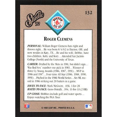 This is a 1992 Studio Roger Clemens baseball card. The card is #132 and pictures show condition.