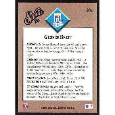 This is a 1992 Studio George Brett baseball card. The card is #181 and pictures show condition.