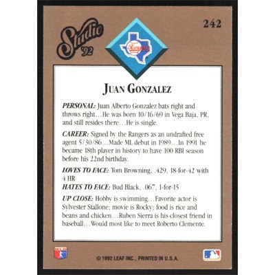 This is a 1992 Studio Juan Gonzalez baseball card. The card is #242 and pictures show condition.