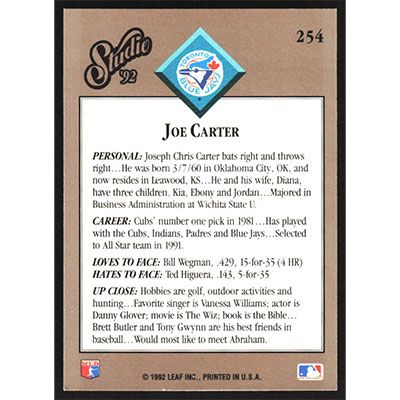 This is a 1992 Studio Joe Carter baseball card. The card is #254 and pictures show condition.