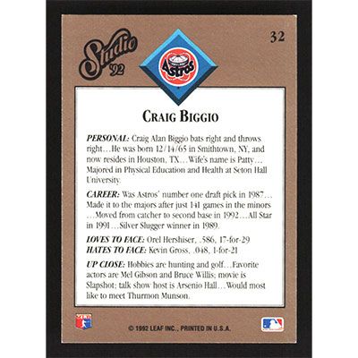 This is a 1992 Studio Craig Biggio baseball card. The card is #32 and pictures show condition.