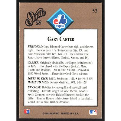 This is a 1992 Studio Gary Carter baseball card. The card is #53 and pictures show condition.