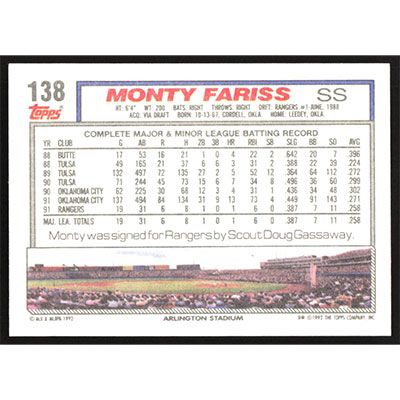 This is a 1992 Topps Monty Fariss baseball card. The card is #138 and pictures show condition.