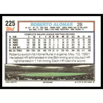 This is a 1992 Topps Roberto Alomar baseball card. The card is #225 and pictures show condition.