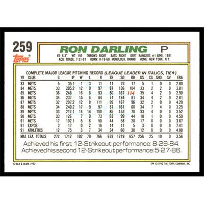 This is a 1992 Topps Ron Darling baseball card. The card is #259 and pictures show condition.