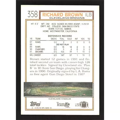 This is a 1992 Topps Richard Brown football card. The card is #358 and pictures show condition.