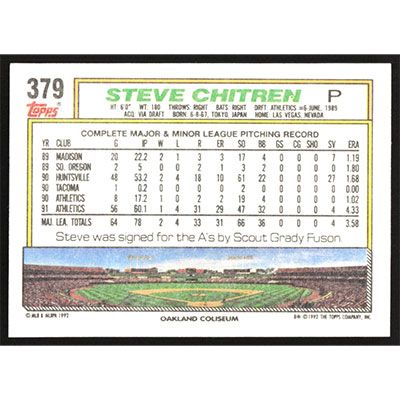 This is a 1992 Topps Steve Chitren baseball card. The card is #379 and pictures show condition.