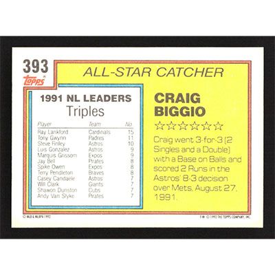 This is a 1992 Topps Craig Biggio All-Star baseball card. The card is #393 and pictures show condition.