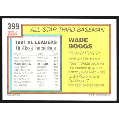 This is a 1992 Topps Wade Boggs All-Star baseball card. The card is #399 and pictures show condition.