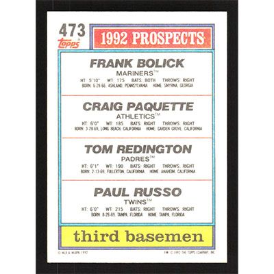 This is a 1992 Topps Frank Bolick, Craig Paquette, Tom Redington and Paul Russo baseball card. The card is #473 and pictures show condition. Team(s): Seattle Mariners/Oakland Athletics/San Diego Padres/Minnesota Twins