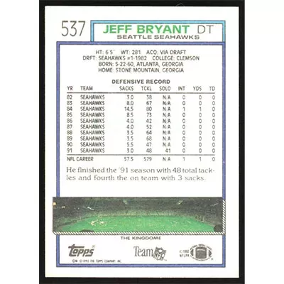 This is a 1992 Topps Jeff Bryant football card. The card is #537 and pictures show condition.