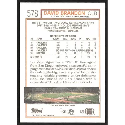 This is a 1992 Topps David Brandon football card. The card is #578 and pictures show condition.