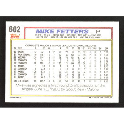 This is a 1992 Topps Mike Fetters baseball card. The card is #602 and pictures show condition.