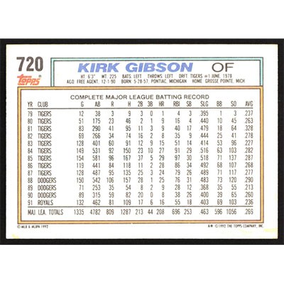 This is a 1992 Topps Kirk Gibson baseball card. The card is #720 and pictures show condition.