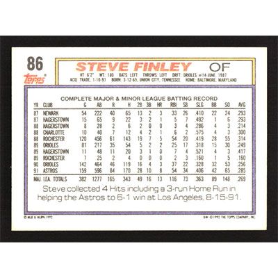 This is a 1992 Topps Steve Finley baseball card. The card is #86 and pictures show condition.