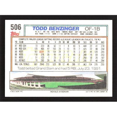 This is a 1992 Topps Gold Todd Benzinger baseball card. The card is #506 and pictures show condition.