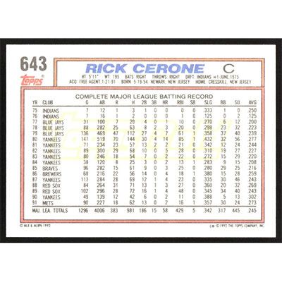 This is a 1992 Topps Gold Rick Cerone baseball card. The card is #643 and pictures show condition.