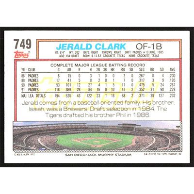 This is a 1992 Topps Gold Jerald Clark baseball card. The card is #749 and pictures show condition.