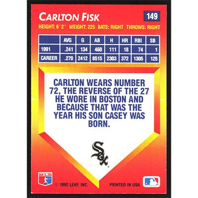 This is a 1992 Triple Play Carlton Fisk baseball card. The card is #149 and pictures show condition.