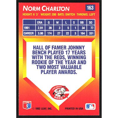 This is a 1992 Triple Play Norm Charlton baseball card. The card is #163 and pictures show condition.