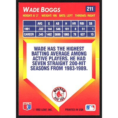 This is a 1992 Triple Play Wade Boggs baseball card. The card is #211 and pictures show condition.