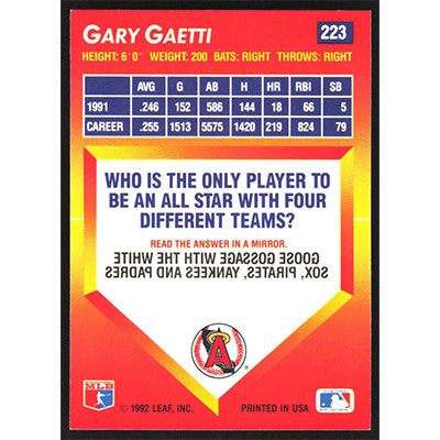 This is a 1992 Triple Play Gary Gaetti baseball card. The card is #223 and pictures show condition.