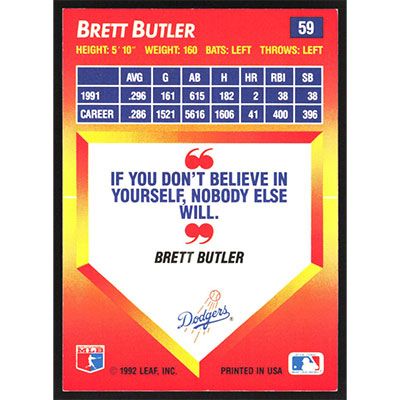 This is a 1992 Triple Play Brett Butler baseball card. The card is #59 and pictures show condition.