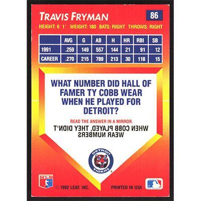 This is a 1992 Triple Play Travis Fryman baseball card. The card is #86 and pictures show condition.