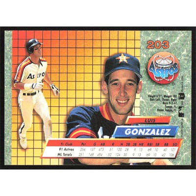 This is a 1992 Ultra Luis Gonzalez baseball card. The card is #203 and pictures show condition.
