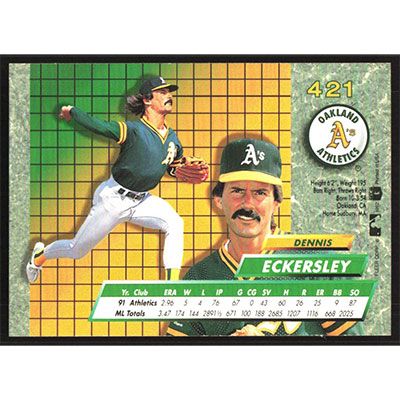 This is a 1992 Ultra Dennis Eckersley baseball card. The card is #421 and pictures show condition.
