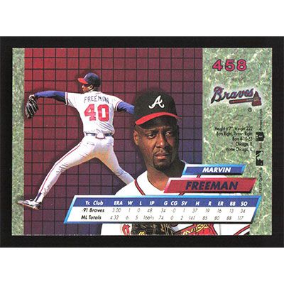 This is a 1992 Ultra Marvin Freeman autographed baseball card. This card has been signed, in blue, by Marvin Freeman, and is guaranteed authentic by Ballcardz.com. The card is #458 and pictures show condition.