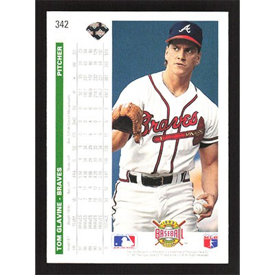 This is a 1992 Upper Deck Tom Glavine baseball card. The card is #342 and pictures show condition.