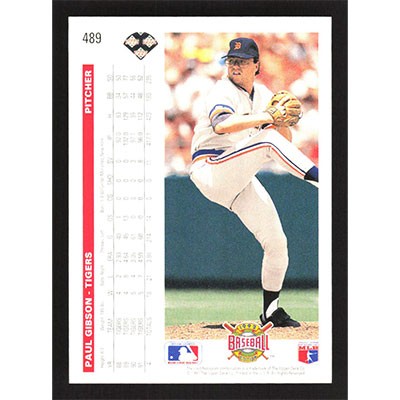 This is a 1992 Upper Deck Paul Gibson baseball card. The card is #489 and pictures show condition.