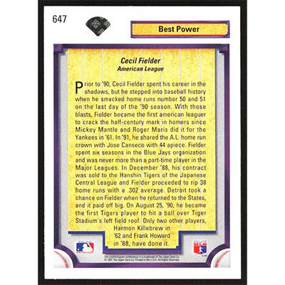 This is a 1992 Upper Deck Cecil Fielder Diamond Skills baseball card. The card is #647 and pictures show condition.