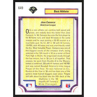 This is a 1992 Upper Deck Jose Canseco Diamond Skills baseball card. The card is #649 and pictures show condition.