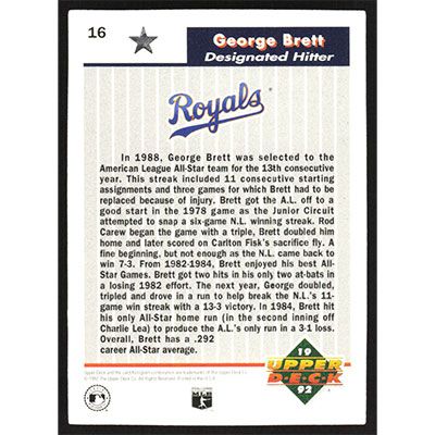 This is a 1992 Upper Deck All-Star FanFest George Brett baseball card. The card is #16 and pictures show condition.
