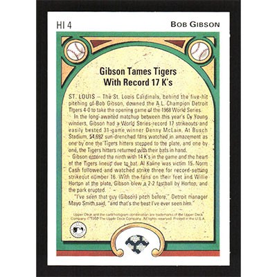 This is a 1992 Upper Deck Heroes Highlights Bob Gibson baseball card. The card is #HI4 and pictures show condition.