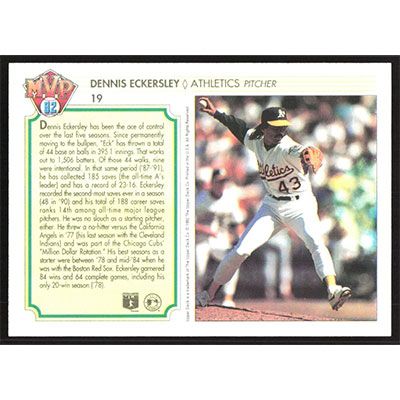 This is a 1992 Upper Deck Team MVP Holograms Dennis Eckersley baseball card. The card is #19 and pictures show condition.