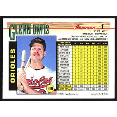 This is a 1993 Bowman Glenn Davis baseball card. The card is #1 and pictures show condition.