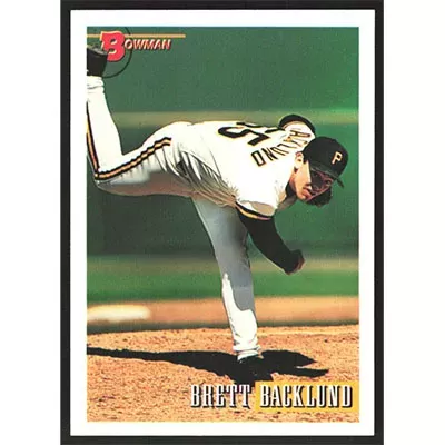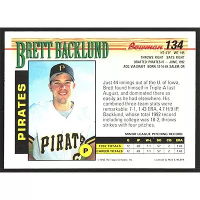 This is a 1993 Bowman Brett Backlund baseball card. The card is #134 and pictures show condition.