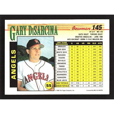 This is a 1993 Bowman Gary DiSarcina baseball card. The card is #145 and pictures show condition.