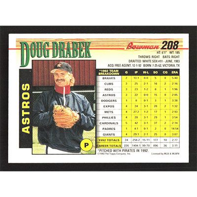This is a 1993 Bowman Doug Drabek baseball card. The card is #208 and pictures show condition.