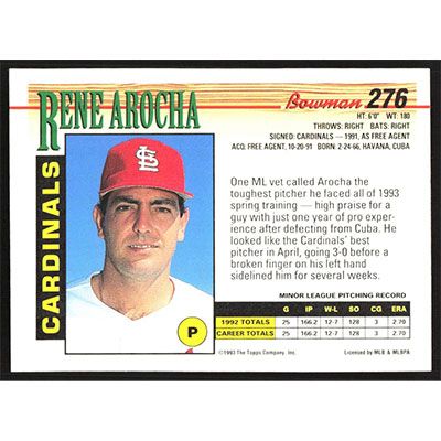 This is a 1993 Bowman Rene Arocha baseball card. The card is #276 and pictures show condition.