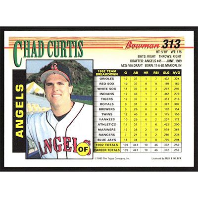 This is a 1993 Bowman Chad Curtis baseball card. The card is #313 and pictures show condition.