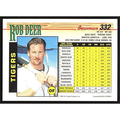 This is a 1993 Bowman Rob Deer baseball card. The card is #332 and pictures show condition.