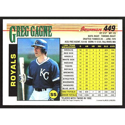This is a 1993 Bowman Greg Gagne baseball card. The card is #449 and pictures show condition.