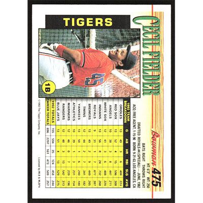 This is a 1993 Bowman Cecil Fielder baseball card. The card is #475 and pictures show condition.