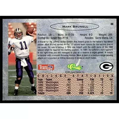 This is a 1993 Classic Mark Brunell football card. The card is #88 and pictures show condition.