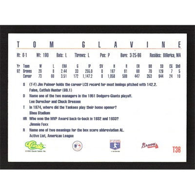 This is a 1993 Classic Game Tom Glavine baseball card. The card is #T36 and pictures show condition.