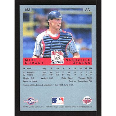 This is a 1993 Classic/Best Mike Durant baseball card. The card is #152 and pictures show condition.